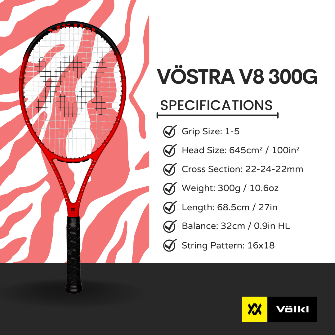 The VÖSTRA V8 300g performs across the board, easy power generation, great spin potential and great feel translate to confidence on every shot. Add in Völkl technology along with the reputation for arm-friendly rackets and players have a racket which allows them to train harder and longer with less fatigue!*
